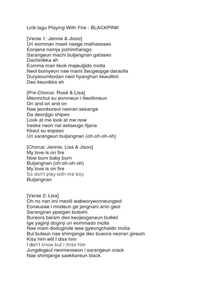 20 Jul 2020 1540 WIB Diperbarui 20 Jul 2020 1540 WIB. Lirik Lagu Blackpink - Playing with Fire dan Terjemahannya Jennie Uri eomman maeil naege malhaesseo Eonjena namja josimharago Sarangeun machi buljangnan gataseo dachinikka Eh Jisoo Eomma mari kkok majeuljido molla Neol bomyeon nae mami tteugeopge daraolla Duryeoumbodan neol hyanghan kkeullimi deo keunikka Eh. Blackpink saat tampil di Coachella Valley Music and Arts Festival California 1942019.